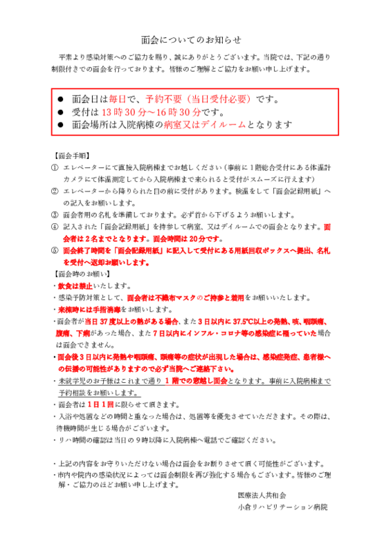 面会手順やお願い事項等を以下に掲載しておりますので、必ずご確認をお願いいたします。