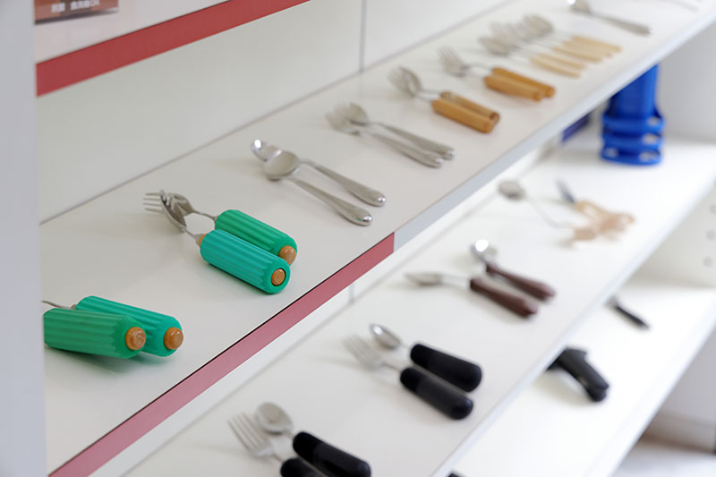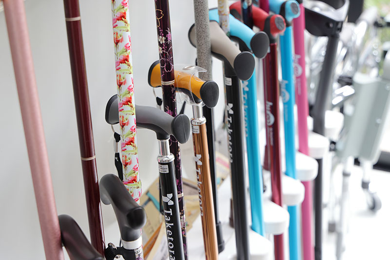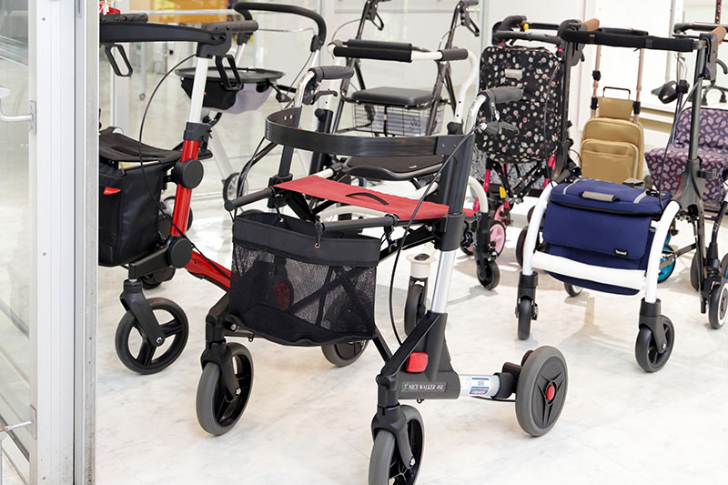 杖や歩行器、車いす、介護ベッド、入浴用品、食事用品など約500点の福祉用具を展示しています。アビリティーズ・ケア・ネット株式会社からの出向の協力を得て、新商品の紹介や商品の取り扱い、販売、貸出を行っています。